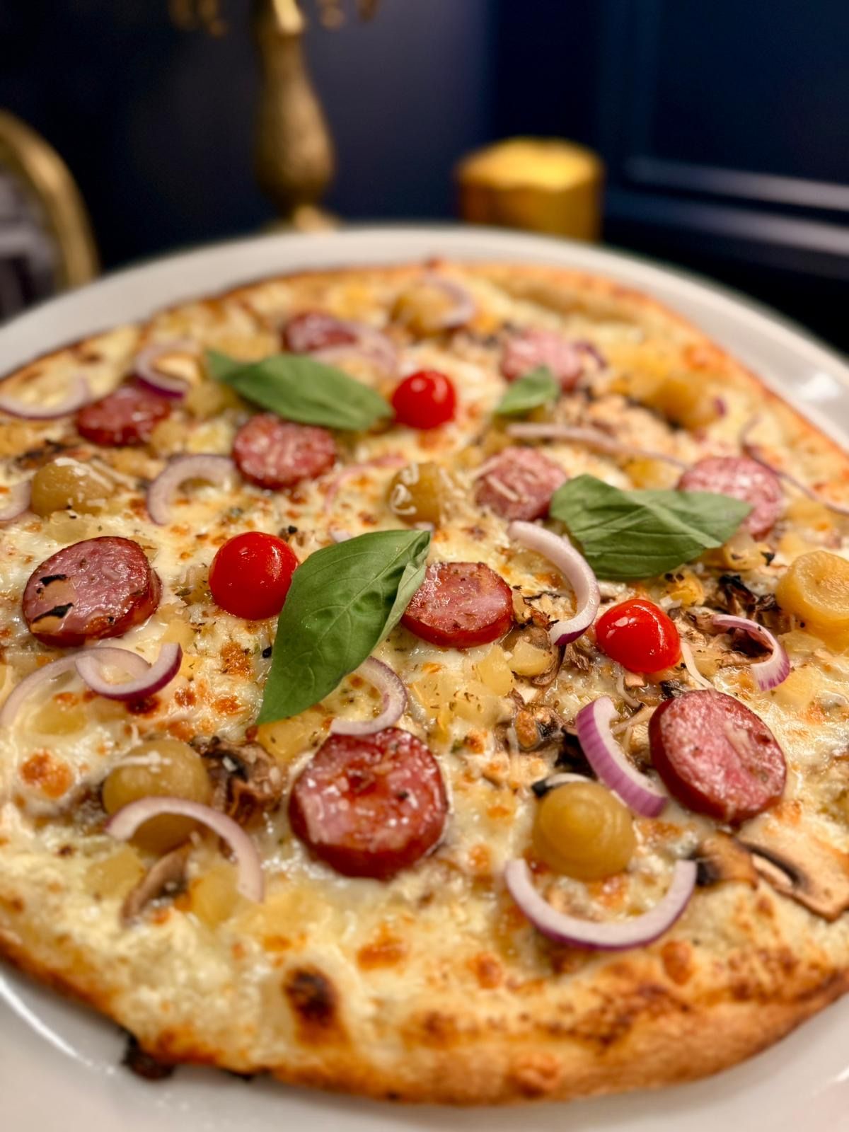 Tomate, mozzarella fior di latte, jambon italien, champignons frais, olives italiennes
